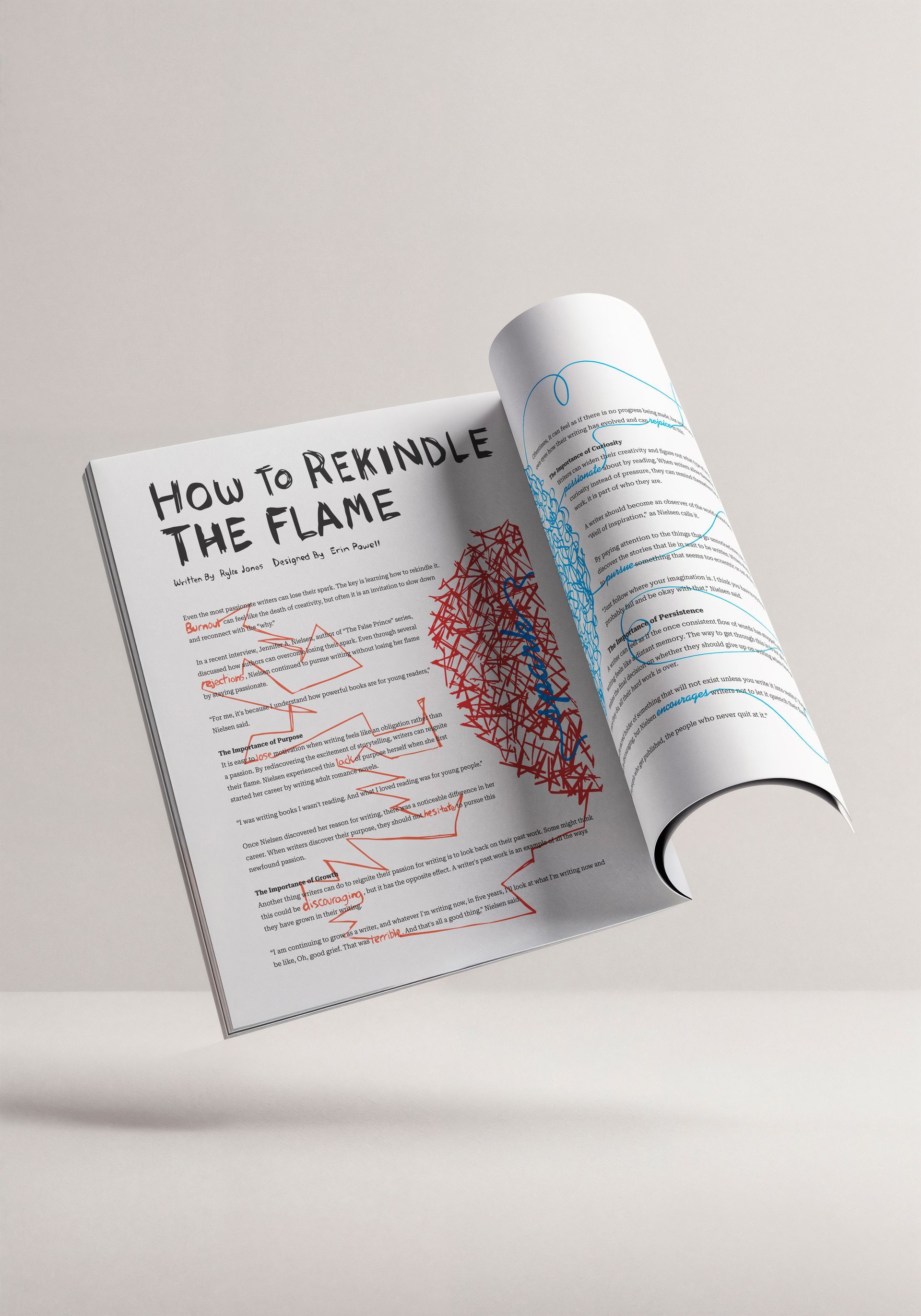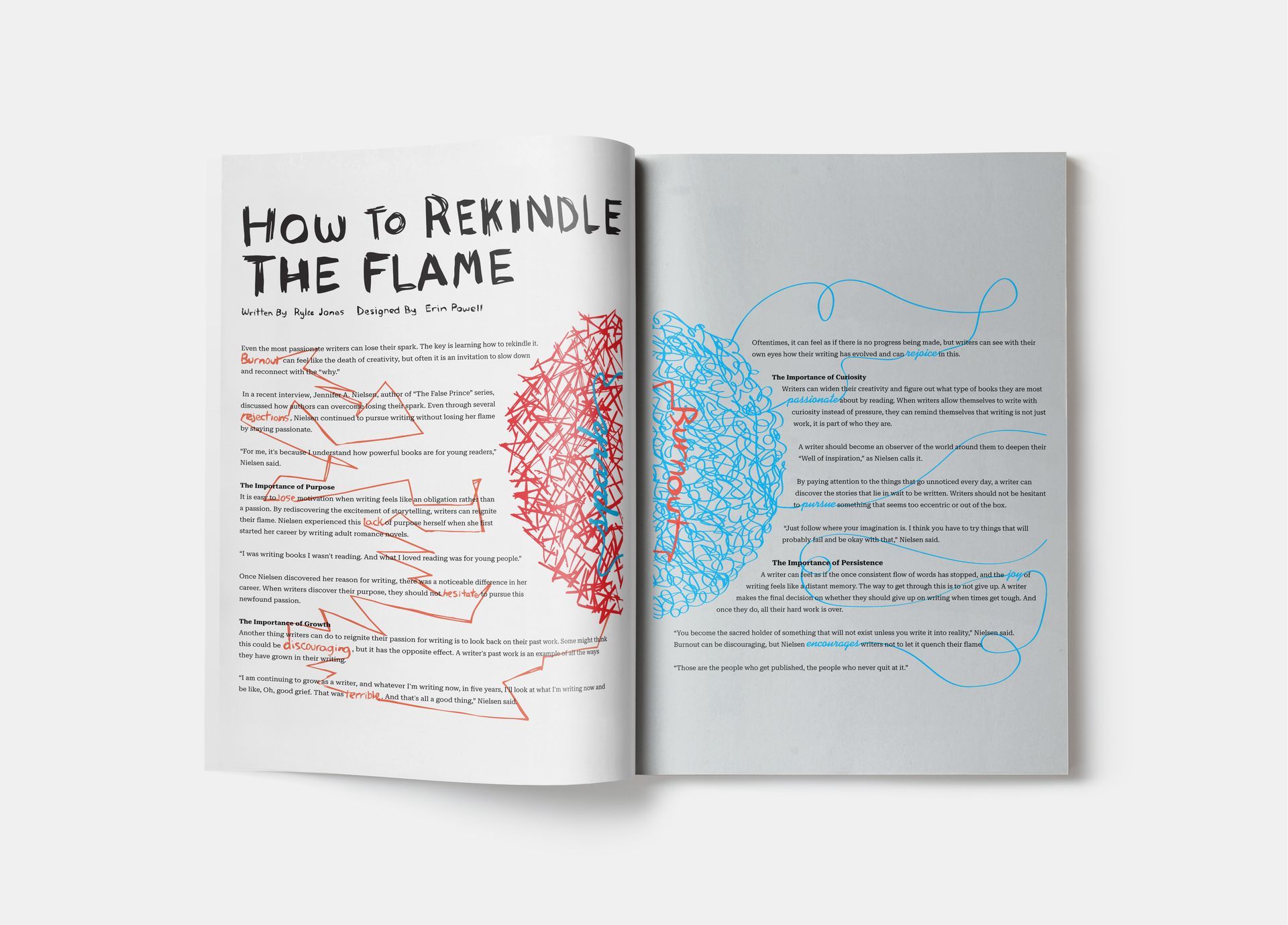 I designed a spread for “How to Rekindle the Flame” by Rylee Jones, an inspirational piece about overcoming creative burnout and rediscovering motivation. When I was designing the spread, I wanted to capture the battle between burnout and rekindling your flame. Burnout can leave someone with the chaos of worry and anxiety. It is not delicate or pretty, it is rough and sharp. Rekindling your flame, or finding your spark, can ease the anxiety and be more calming. This contrast helped communicate the emotional journey between struggle and inspiration, reinforcing the message of the writing.